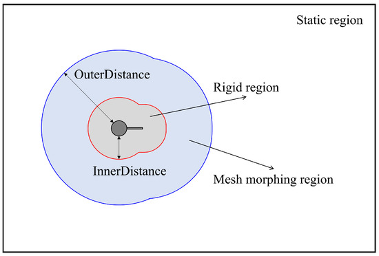 Owing to the oscillatory motion of the cylinder-plate assembly, a dynamic meshing methodology which can accommodate a changing geometry due to this motion is utilized in our numerical simulations. To this purpose, the whole computational domain is divided into three distinct regions through the definition of two parameters—innerDistance and outerDistance—which (1) allows the moving mesh zone between the body surface and innerDistance to move with the cylinder-plate assembly without any deformation; (2) defines a mesh morphing zone between innerDistance and outerDistance, allowing the mesh in this zone to be deformed and updated at each time step using a spherical linear interpolation scheme (SLERP); and, (3) specifies the static mesh zone beyond outerDistance. The partitioning of computational domain into three regions through the specification of innerDistance and outerDistance is displayed in Figure 4. The existence of a directly moving mesh zone can effectively improve the simulation accuracy in the mesh region surrounding the cylinder-plate assembly, and guarantee the computational stability of the numerical solution, particularly when the structure undergoes a significant displacement [1].