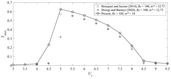 Comparison of numerical results between the present study and previous numerical investigations (Bourguet and Jacono [44], Dorogi and Baranyi [45]) for the normalized maximum transverse displacement as a function of the reduced velocity . The current numerical simulations are of the VIV response of a circular cylinder for , , and . The resolution of used in present simulations is 0.5.