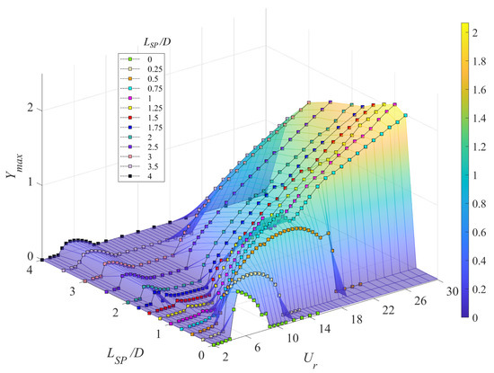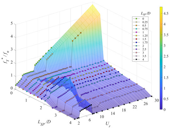 Figure 8 and Figure 9 display the three-dimensional (3D) plots of the maximum transverse displacement (amplitude) and the non-dimensional dominant transverse displacement oscillation frequency , respectively, as a function of the splitter-plate length and the reduced velocity . A careful examination of these plots reveals the dynamical characteristics of the nonlinear system that can be divided into three regimes: namely, (1) in the regime where –0.5, the cylinder-plate assembly undergoes a self-limiting vibration that occurs over a limited range of the reduced velocity with the oscillation frequency locked near the structural natural frequency (which can be identified as a VIV-type response); (2) in the regime where –3.5, the cylinder-plate assembly undergoes a non-limited vibration with a monotonically increasing oscillation amplitude with increasing reduced velocity—this regime exhibits complex frequency characteristics and can be identified as a galloping-type response; and, (3) in the regime where , there is no obvious oscillation induced on cylinder-plate assembly, at least for values of up to 30. Figure 8 and Figure 9 show clearly that the dynamical response of a cylinder-plate assembly has a strong dependence on the splitter-plate length and the reduced velocity.