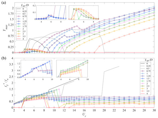 Plots of (a) the normalized vibration amplitude () and (b) the normalized dominant vibration frequency () as a function of the reduced velocity stratified in terms of the splitter-plate length .