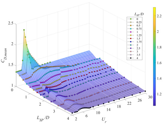 Three-dimensional plot of the time-averaged (mean) drag coefficient as a function of the splitter-plate length and the reduced velocity .
