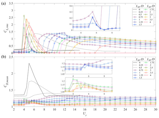 Variation of aerodynamic fluid forces acting on a cylinder-plate assembly: (a) the root-mean-square lift coefficient and (b) the time-averaged (mean) drag coefficient as a function of the reduced velocity and stratified with respect to the plate length .