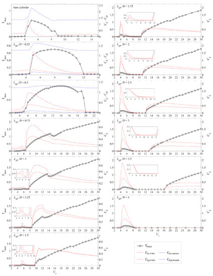 Figure 13a,b display the fluid force coefficients and of the cylinder-plate assembly, respectively, as a function of the reduced velocity stratified by the different values of the plate length . For the bare circular cylinder, the lift and drag coefficients first increase sharply at the onset of VIV, reaching peak values of and at . After VIV onset, decreases rapidly to near zero during lock-in and thereafter increases slightly again to a value of 0.2 and remains constant at this value when the system has transitioned out of lock-in. Furthermore, also undergoes a sudden decrease from a peak value of 2.35 to a value of 1.35 where it remains constant with increasing —the latter value for is the same as that before lock-in.