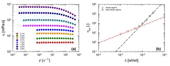 (a) Steady viscosity, , as a function of shear rate, , parametric in the κ-c concentration, at 60 °C. (b) Specific viscosities, , at 60 °C () as a function of the κ-c concentration in solution. Power-law regressions are reported with dashed lines (red line, slope ; black line, slope ).