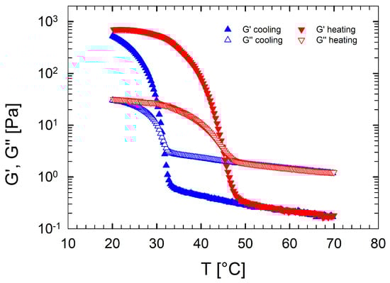 Dynamic temperature ramp tests (DTRTs) were carried out at a frequency of 10 rad/s and a deformation of 5%, within the linear viscoelastic region. To determine the temperature dependence of the viscoelastic moduli, each DTRT was performed in a temperature range between 80 °C and 20 °C, at fixed cooling/heating rates (1 °C/min, 3 °C/min, and 5 °C/min). Hot solutions were loaded into the rheometer at 80 °C, cooled down to 20 °C, and, after a soaking time of 300 s, heated up again to 80 °C. The transition temperatures, defined as the minimum of the derivative of with respect to temperature, were evaluated via DTRTs. The transition temperature during cooling is indicated as , whereas the transition temperature during heating is indicated as [,].