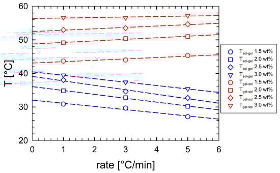 Figure 4 reports the transition temperatures as a function of the imposed cooling/heating rate, for solutions with κ-c concentrations ranging between 1.5 wt% and 3 wt%. The dashed lines are the best linear fits of the experimental transition temperatures, obtained via Equation (2):