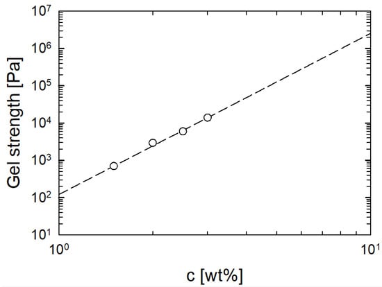 where b and n are fitting parameters. The values of these parameters are and . The same power-law trend is also found for other biopolymers such as agarose, gelatin, alginate, and gellan gum [,,,]. As an example, the exponent at low agarose concentrations was larger than 4 and was smaller than 2 for higher concentrations [].