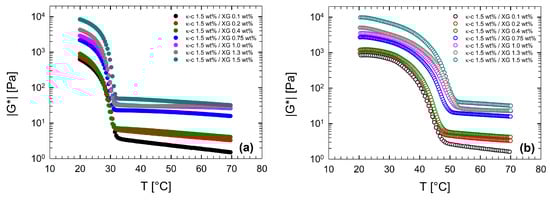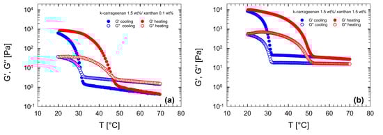Figure 7 reports the temperature dependence of the viscoelastic moduli at 1 °C/min for the lowest (0.1 wt%, Figure 7a), and the highest (1.5 wt%, Figure 7b) XG concentrations. The thermal behavior of the viscoelastic moduli, shown in Figure 7a, is similar to that of water/κ-c solutions, previously discussed. By comparing Figure 7a and Figure 3, it is evident that no difference appears in the ramp response for samples with and without XG. This was confirmed up to an XG concentration of 0.4 wt%.