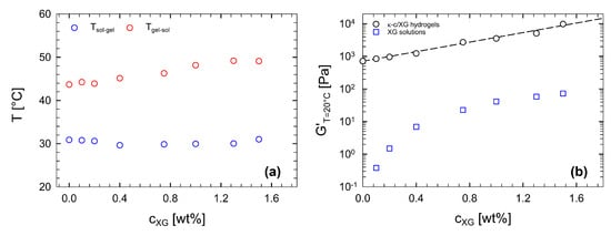 A special focus on how the transition temperatures and the elastic moduli vary with XG concentration is provided in Figure 9a,b, respectively. Figure 9a shows that, irrespective of the amount of XG, the gelation temperature can be considered to be constant with XG concentration. The melting temperature weakly depends upon the XG content, and only for concentrations above 0.4 wt%.