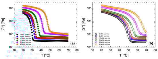 The results of the DTRTs, performed at 1 °C/min, are shown in Figure 10, where is plotted as a function of the temperature and the sugar concentration, for both cooling (Figure 10a) and heating (Figure 10b) ramps. Figure 10 indicates that the complex modulus is strongly affected by the sugar concentration, as the curves are shifted horizontally to higher temperatures, and vertically to higher values. The latter marks an improvement in the mechanical properties of the produced gel. Furthermore, the addition of sugar also affects the transition temperatures. In particular, sugar promotes gel formation and delays its melting. Thus, sugar not only enhances the gel network but also improves its thermal stability.