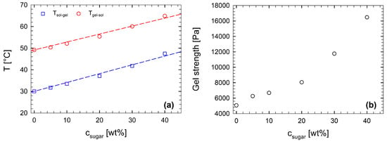 Figure 11a reports the two characteristic temperatures, and , as functions of the sucrose concentration. The presence of sugar has a non-negligible effect on both transitions. By comparing the samples at 0 wt% and 40 wt% of sugar concentration, the sol-gel temperature increases by ; the gel-sol temperature, on the other hand, increases by 32%. In Figure 11a, the dashed lines are linear fits to the experimental data. is the value of the sol-gel temperature of the solution containing only κ-c and XG. The same approach extends to . The values of the fitting parameter, a, is and for and , respectively. Both transition temperatures increase linearly with increasing sugar concentration.