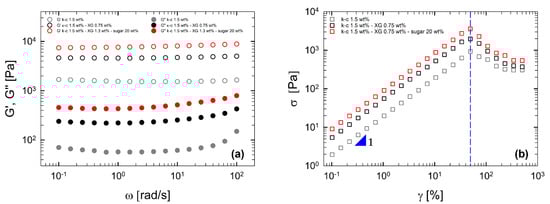Figure 12a reports the viscoelastic moduli as a function of frequency, at 20 °C, for three representative samples. They show the classical response of a strong gel, with the elastic modulus practically independent of frequency and much larger than the dissipation modulus []. Figure 12b displays the oscillatory stress as a function of the oscillatory shear strain, obtained from a dynamic strain sweep test at 20 °C, for the same samples as Figure 12a. Initially, the stress increases linearly with strain, up to a limiting value, beyond which the samples lose their equilibrium microstructure. The stress and strain critical values can be seen as a measure of the yield behavior of the gel [,]. Table 3 reports the yield stress and yield strain values of some samples investigated in this work. The yield strain value appears to be affected solely by the κ-c concentration, whereas the yield stress depends on both the addition of XG and sucrose.