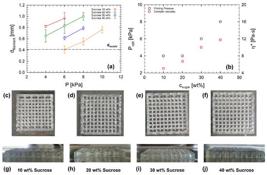 (a) Filament diameter as a function of the printing pressure, for samples with 1.5 wt% κ-c and 1.3 wt% XG, at different sucrose levels. Error bars result from different measurements. (b) Optimized printing pressure (left y-axis) and complex viscosity, evaluated at 10 °C from data shown in Figure 10a (right y-axis), as functions of sucrose concentration, for samples with 1.5 wt% κ-c and 1.3 wt% XG. Snapshots of the frontal area (c–f) and side area (g–j) of the printed grids extruded under best pressure conditions.
