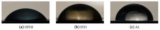 As previously mentioned, three surfaces were analyzed: uncoated aluminum alloy (AL), standard epoxy coating (STD), and a hydrophilic lacquer (HPHI). From the results of previous studies [10], the HPHI surface should be the one with the lowest contact angles, so highest wettability, and best performance.