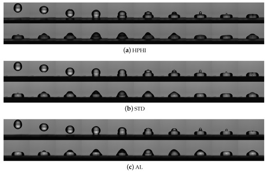 Figure 5 shows three sequences of frames obtained from the three high-speed videos of a drop falling on the HPHI surface, in Figure 5a, on the STD surface, in Figure 5b, and on the AL surface, in Figure 5c.