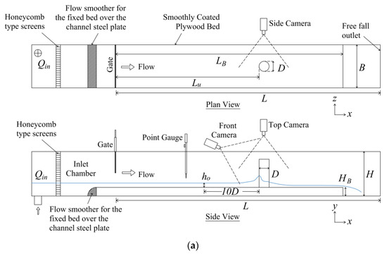 The definitions of the notations shown in Figure 1a are as follows: is the working length of the channel (=12.5 m); is the distance to the emergent cylindrical obstacle from the vertical gate (=2.8 m); is the length of the fixed bed installed inside the channel (=6.5 m); is the height of the bed fixed inside the channel (=0.1 m); is the inlet flow discharge; the upstream water depth () was measured at a distance equal to (or ) from the upstream face of the emergent cylinder; the mean velocity of the flow was obtained with ; is the depth of the channel (=0.4 m); is the diameter of the circular cylinder; and is the width of the rectangular cylinder. Changing the inlet discharge, channel slope (), and cylinder dimensions ( or ) made it possible to independently modify the approach flow conditions (or ) and the Froude number (). The details for each experimental case considered in the experiments are presented in Table 2.