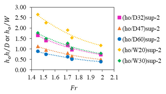 As shown in Figure 2b, when changing the geometry of the cylinder ( or ), the length of the surface bow-wave () remains proportional to the (or ) [32,35,41]. When the diameter or width of the emergent cylinder increases, the surface bow-wave’s length () increases due to the blockage ratio.