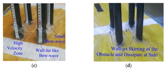 Furthermore, we observed a slight, abrupt water depth increase over the RC compared to the CC at the toe of the wall jet, as shown in Figure 6a. For the CCs, when increasing the cylinder diameter, the contact area for the flow also increased, but, due to its shape, no abrupt increase in water depth occurred at the front except for the wall jet. As shown in Figure 6a, the supercritical flow in case C1 was skirted with a smaller aerated region over the CCs compared to the RCs due to its geometry [35]. A similar flow phenomenon occurred at the front face for the supercritical flow in case C2, as shown in Figure 6b. With the supercritical flow in case C4, a small bow-wave was formed over the cylinders’ front face in the second row, as shown in Figure 6c. Figure 6d shows the skirting of the wall jet around the circular cylindrical column surface and the dissipation from both sides as lateral jets in case C4.