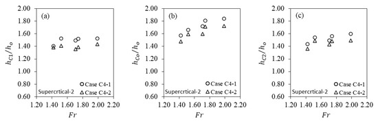 The percentage increment in the water depth for the supercritical flow over the horizontal channel bed in case C4-1 at point ranged between 28.8 and 34.5%, while at point , it ranged between 36.4 and 45.7%, and at point , it ranged between 30.5 and 37.5%. Further, for case C4-2 with supercritical flow over the horizontal channel bed, the percentage increments in the water depth at points , , and were 27.7–30.5%, 32.4–42.0%, and 26.7–33.0%, respectively. This scenario showed the opposite results as for the supercritical flow over a 1/200 sloping channel bed. Due to this phenomenon over the sloping bed, the flow became hypercritical downstream following the cylinder arrays in cases C2 and C4 [39,40,51,52].