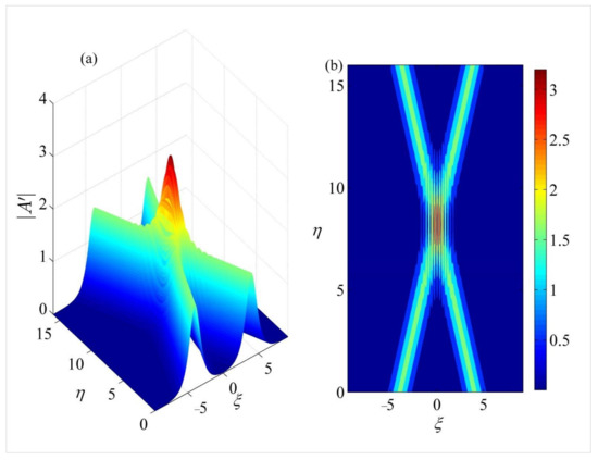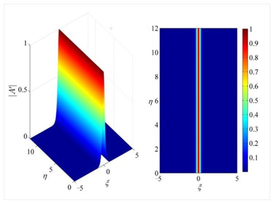 Therefore, Equation (8) yields the soliton solution in the following form: