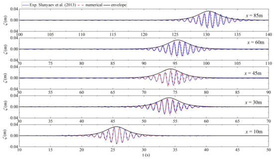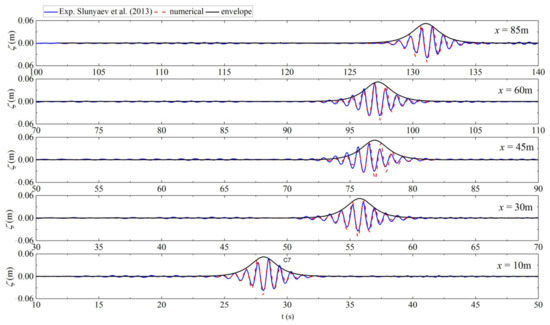 Figure 1 shows the profile of a soliton with k0 = 4.8, ε0 = 0.157, γ0 = 0.1, h = 1, N = 2048, and step size ∆η = 0.0006, 1 ≤ m ≤ 20,000, where m denotes the mth time step. We carried out sensitivity analyses on grid size and time step; the results are not dependent on the selection of grid size and time step. However, for simplicity, relevant images are not included here. In the transformed domain, the amplitude and shape of the soliton remain invariant during propagation. Firstly, the accuracy of the evolution envelope equation in the isolated subspace was investigated. Slunyaev et al. [36] studied the stability of deep water waves and the existence of strong nonlinear groups through laboratory and numerical simulations. Figure 2 shows a comparison between experimental and numerical simulated surface elevations at five different locations. The small wave steepness obtained in a physical basin may be due to the specificity of the boundary conditions of the wave generator (Equation (14)) or wave dissipation near the wave generator. Under the same initial conditions, compared with numerical simulation, the standing wave group in laboratory experiments ultimately appears to have a smaller steepness. Therefore, the experimental cases shown in Figure 2 (ε0 = 0.2) and Figure 3 (ε0 = 0.30) are compared with the numerical simulations of groups ε0 = 0.157 and ε0 = 0.25, respectively. Some deviations between the experimental and numerical results are observed at a relatively larger distance. NLS equation may be very useful in describing the general characteristics of initial narrow band water wave sequences that evolve in deep and intermediate-depth water. However, the focusing characteristics of the deep water NLS equation inevitably led to significant spectral broadening, which violates the basic assumptions used in the derivation of the NLS equation [37], and can lead to deviations between numerical simulation and experimental results. The time frequency analysis shown in Figure 4 and Figure 5 clearly demonstrates the stationary waves.