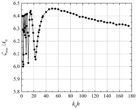 Peak value of the surface elevation versus the relative water depth, k0h, with ε0 = 0.08, k0 = 5, a1 = −a2 = 21, a3 = −a4 = 7, b = 1.6, ξ1 = −ξ2 = 6, ξ3 = −ξ4 = 2, φ1 = φ2 = φ3 = φ4 = 0.