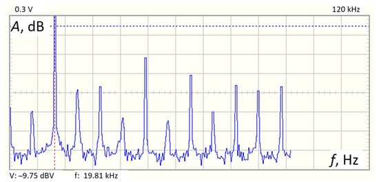 Ultrasonic multifrequency specter for the frequency of 19.8 kHz: A—amplitude; f—frequency.