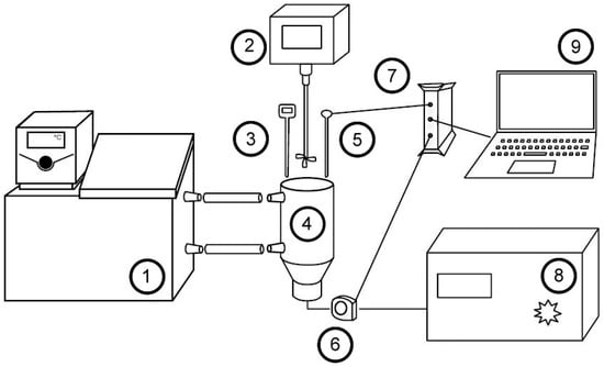 Experimental set-up for ultrasonic upgrading of heavy oil in laboratory conditions. 1—circulating thermostat; 2—rotational viscosimeter; 3—thermocouples; 4—reactor vessels with heat jackets; 5—hydrophones; 6—current transformer; 7—digital oscilloscope; 8—industrial ultrasound generator UZG-22; 9—computer.