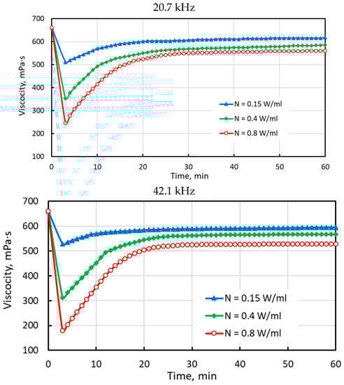 Heavy oil samples were sonicated for 3 min under various acoustic frequencies (20.7 kHz; 42.1 kHz and 62.2 kHz) and power (0.15 W/mL; 0.4 W/mL and 0.8 W/mL), with measuring the viscosity of the samples up to 60 min (Figure 4) in order to evaluate the relaxation of viscosity values, which is very common for ultrasonic treatment processes. One can observe that viscosity values for the whole sample increased just after termination of sonication, but were still lower than the initial viscosity values. The plateau phase for the whole sample initiated after 20 min. The increase in the viscosity values after termination of ultrasonic irradiation, or, in another words, relaxation phenomenon, can be explained by the changes in the colloidal structure of dispersed oil systems. The viscosity relaxation of heavy crude oil samples can be attributed either to the polymerization of the cracked fragments of asphaltene molecules or their self-aggregation. It is well-known that asphaltenes exhibit a tendency toward self-aggregation and can form asphaltene nanoaggregates, which are composed of 6–10 molecules dispersed in crude oil []. The further association leads to clusters of asphaltene nanoaggregates, the size of which in crude oil ranges between 2 and 5 nm []. Such supramolecular reorganization under the impact of ultrasound waves determines the increase in the viscosity of heavy crude oil.
