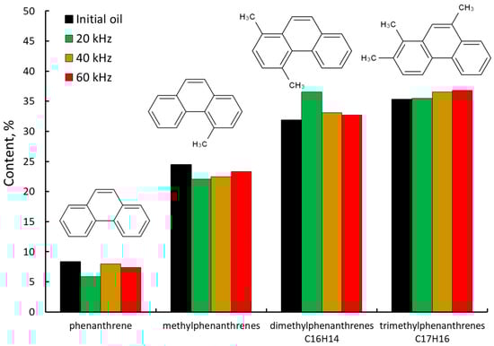 The content of phenanthrenes is also altered under the impact of ultrasound waves. Phenanthrenes are polycyclic aromatic hydrocarbons (PAHs) composed of three fused benzene rings in the structure of asphaltene agglomerates []. The content of phenanthrenes also changes after exposure to ultrasound. The most significant changes were observed in the content of phenanthrene and methylphenanthrene. The changes in the composition of aromatic hydrocarbons confirm the destruction of resins and asphaltenes under the influence of ultrasound. The decrease in the content of resins causes a decrease in viscosity to a greater extent in this case, which is irreversible.
