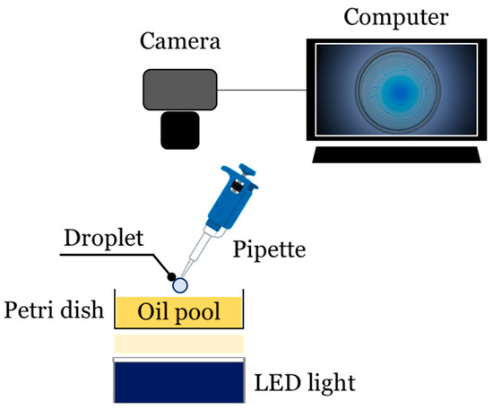 Figure 1 represents a schematic of the experimental setup in the present study. The experimental setup consisted of an oil pool in a Petri dish, a pipette for an injection of droplets, and a digital camera for a visualization. The droplets were placed manually on the oil pool. The droplet behavior was captured using a digital video camera (Nikon, D5600) backlit with an LED light (WTH-C2020, Nissin Electronics Co., Ltd., Hachioji, Japan). To enhance the contrast, the droplets were dyed blue using food coloring. The obtained images were processed using the ImageJ software (1.52v) to estimate the spreading and fingering instability of the droplets. In this study, a 40 wt% 2-propanol (IPA)/water mixture and sunflower oil were used as the droplet and pools, respectively. In a previous study [33], we investigated the speed dynamics of 20, 40, 60, and 80 wt% IPA solutions in sunflower oil. For the 20 wt% IPA solution, the released droplet floated on sunflower oil (no obvious change occurred even after 20 s of contact). For higher concentrations of IPA solution (i.e., 60 and 80 wt%), although spontaneous spreading and atomization were observed on the sunflower oil, the finger length was too short, and the atomized daughter droplet size was too small to observe and quantify the entire process. To better understand the spreading and fingering instability dynamics, we focused on the 40 wt% IPA solution. The depth of the oil pool was fixed at 10 mm. The inner diameter of each Petri dish was 85.7 mm. The droplets released on the oil pool are ≈2.0 mm in diameter. The ambient temperature and relative humidity were 25 °C and 50%, respectively. The droplet motion was recorded at 60 fps with a spatial resolution of ≈85 μm/pixel.