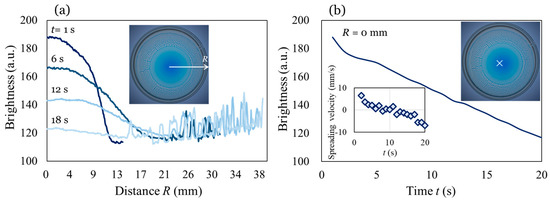 Brightness information obtained during the spreading of 40 wt% IPA solutions on sunflower oil. (a) Brightness profiles at 1, 6, 12, and 18 s. Inset: coordinates of the distance R. (b) Time evolution of the brightness at R = 0 mm (center of spreading film marked as ×). To eliminate the effects of the injection process, the brightness data from 1 s onwards are plotted. Inset: the film-spreading velocity.