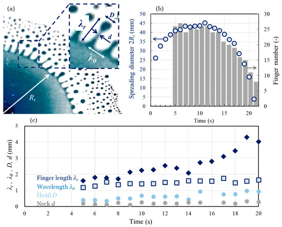 where σso is the interfacial tension between the IPA solution and sunflower oil, ρo is the density of sunflower oil, ρIPA is the density of IPA, and g is the gravitational acceleration. Figure 5a shows the time evolution of the wavelength between the fingers in the circumferential direction. The wavelength was normalized to the capillary length, as described in Equation (2). For σso ~ 3 mN/m [25], ρo = 916 kg/m3, ρs = 781 kg/m3, and g = 9.81 m/s2, the predicted wavelength of ≈1.5 mm agrees well with the experimental data. This model allows us to conclude that a higher concentration of IPA leads to lower interfacial tension and wavelength [29]. In Figure 5, although we characterized the time evolution of the wavelength between the fingers in the circumferential direction by the capillary length for the liquid–liquid interface, the experimental data showed a slight increase with time. This may be due to the effect of evaporation on the interfacial tension caused by a change in the IPA concentration in the spreading film. To verify the effect of interfacial tension distribution by evaporation, future work is expected to measure the IPA concentration distribution during film spreading.