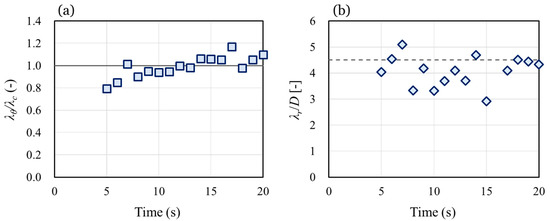 Time evolution of characteristic finger length in the (a) circumferential direction and (b) radial direction. The solid line in (a) and dashed line in (b) indicate the capillary length of the liquid–liquid (IPA solution–sunflower oil) interface predicted using Equation (2) and the most unstable wavelength predicted by the Plateau–Rayleigh instability in Equation (4), respectively.