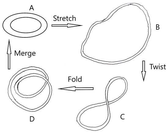 In a turbulent dynamo, the amplification of magnetic fields occurs due to the turbulent stretching of magnetic fields (due to turbulent shear). The basic principle of generating a magnetic field was proposed by Zeldovich in the 20th century and called the Zeldovich "stretch-twist-fold" (STF) dynamo [43,44]. This is based on a simple principle, which is represented in Figure 3. The magnetic field in Figure 3 is represented as a closed rope, which, at the initial stage, is stretched while maintaining its volume, as in an incompressible flow (A → B in Figure 3)—for example, twice. In this case, the cross-section of the rope is reduced by a factor of two, and due to the freezing of the flow, the magnetic field increases by a factor of two. At the next stage, the rope is twisted into a figure “8” (B → C in Figure 3), and then folded (C → D in Figure 3) so that two loops appear, the fields of which are now directed in the same direction and together occupy the same volume as the original rope configuration. The flow through this volume has doubled. Then, the two loops merge into one (D → A in Figure 3) through small diffusion effects. Due to this, the process becomes irreversible. Such combined loops are topologically the same as the original single loop, but now with a factor of two field strength.