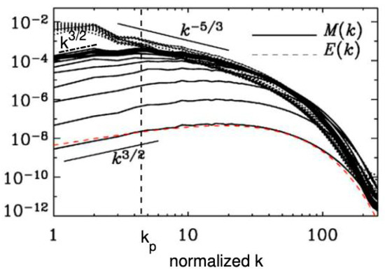 Sketch of the magnetic (solid line) and turbulent kinetic (dashed line) energy spectra in the nonlinear stage of a turbulent dynamo for ; dash-dotted lines indicate different spectral slopes and the vertical dashed line represents the equipartition scale at the end of their simulations. Turbulent kinetic (red dashed line) energy spectra in the nonlinear stage of a turbulent dynamo for . From [50].