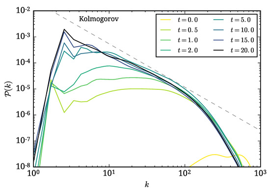 - Maron, J.; Goldreich, P. Simulations of Incompressible Magnetohydrodynamic Turbulence. Astrophys. J. 2001, 554, 1175–1196. [Google Scholar] [CrossRef]