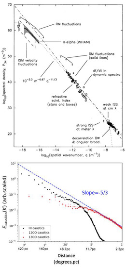 Upper panel: “Extended Big Power Law” of galactic electron density fluctuations obtained combining the scattering measurements in [1] and H measurements from WHAM in [2]. Lower panel: Power law of velocity fluctuations in the direction of the Taurus molecular cloud. From [66].