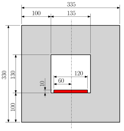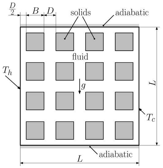 In the present work, solid blocks were used, and the solid to empty cavity volume ratio is . This results in the following dimensions: , , and . Figure 3 shows the schematics of the simulation domain.
