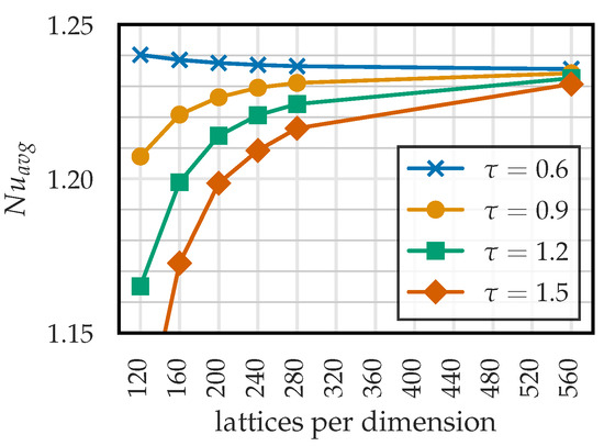 The presented LBM would suffice for all further investigations if only fluid flow were of interest. The problem, however, is that in the context of CHT, in order to account for a spatially varying (but temporally constant) density , specific isobaric heat capacity , and thermal conductivity k within the domain, at least an energy equation in the form of Equation (3) instead of Equation (13) needs to be considered.