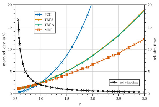 From Equations (5) and (6), the velocity vector can be readily calculated. Several collision operators are available. The most commonly used are the single-relaxation-time (SRT), often referred to as the Bhatnagar–Gross–Krook (BGK) [29] model, and the multiple-relaxation-time (MRT) [30] collision operators. The SRT is defined by a single relaxation time, while the MRT schemes possess as many relaxation times as lattice velocities. A special case of MRT is the two-relaxation-time (TRT) [31] scheme. In addition to the standard MRT, there are more sophisticated variants, such as the cascaded [32] and cumulant [33] collision operators, which will not be considered in this study. The simplest variant is the BGK [29], given by