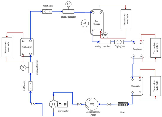 A refrigerant pump, a refrigerant mass flow meter, a preheater, a test section “the plate heat exchanger”, a condenser, a subcooler, three mixing chambers, and three sight glasses comprised the refrigerant loop. The refrigerant pump was a Shimpo pump powered by a DC motor that was controlled by a variable DC output motor controller. A rotating DC motor controlled the fluctuation of the liquid CF3I flow rate by changing the DC current. A mass flow meter (MASSMAX), positioned between the pump and preheater, was used to monitor the refrigerant flow rate. The preheater transferred heat from hot water to CF3I to evaporate the refrigerant to a specific vapor quality at the inlet of the test section. The saturated vapor then entered into the test section and the CF3I condensed there. The vapor–liquid two-phase refrigerant from the outlet of the test section was finally condensed in the condenser. Then the refrigerant was subcooled by controlling the flow rate of a low-temperature water brine mixture in the subcooler. The system pressure of the refrigerant loop could be controlled by adjusting the temperature in the condenser. The purpose of the filter was to remove any solid particles that may have been present in the loop. The refrigerant coming from the exit of the test section was maintained in a subcooled condition to prevent cavitation at the pump inlet. Three mixing chambers were installed before and after the test section, as well as before the preheater, to monitor the absolute pressure and temperature of the refrigerant. The state of the refrigerant flowing through the refrigerant loop of the experimental apparatus could be observed through the sight glasses. The entire pressure drop across the refrigerant side of the vertical PHE was measured using a differential pressure transducer. K-type and T-type thermocouples were used after calibration to measure all the temperatures in the loop.