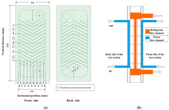 Additionally, most of the literature discusses the overall heat transfer coefficient, and very few papers have discussed local heat transfer characteristics inside the brazed plate heat exchanger. To further understand the heat transfer characteristics from the information on local heat transfer, a specially designed test section was constructed for the present study to measure the local heat transfer coefficient obtained from local wall temperature and heat flux.
