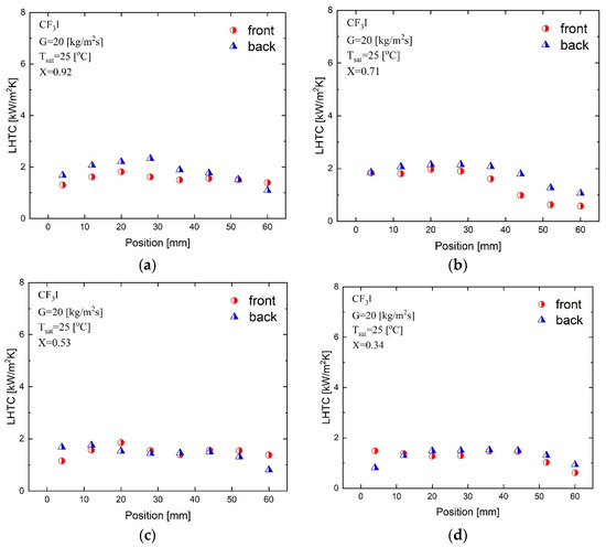 x = 0.92 and 0.71. However, there were some significant differences in the local heat transfer coefficients from the front and back side plates at horizontal distances of 28 mm and 36 mm and a vapor quality of 0.92. For a vapor quality of 0.71, the heat transfer coefficient of the back side of the test section plate was higher than that of the front side at horizontal distances from 36 mm to 54 mm. As shown in