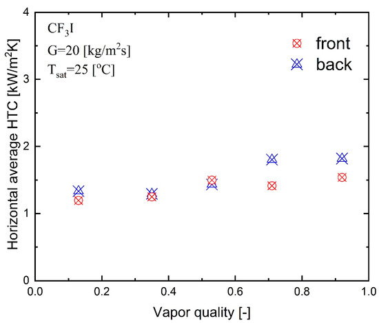 2 in relation to vapor quality at the front and back sides of the PHE. These heat transfer coefficients were obtained from the average heat transfer coefficient data at various positions in horizontal distances for the front and back side, respectively, at a certain vapor quality.