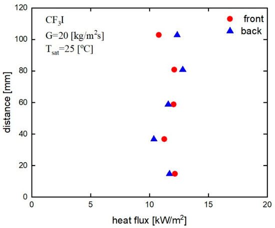 2s, a saturation temperature of 30 °C, and a horizontal position of 12 mm from the end face of the cross-section of the test plates. There is no significant difference in the local heat flux found for the front and back sides of the PHE except at the inlet (117.5 mm from the bottom port of the test section) where the back side heat flux is slightly higher than that of the front side. This also signifies that the heat transfer coefficients in the condensation inlet and the very next measurement point of the back side of the PHE (at vapor quality 0.92 and 0.71) are higher than those of the front side, which has already been discussed in