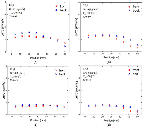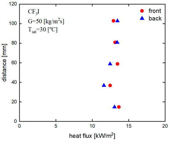 The front and back sides of the plate heat exchanger do not have significant differences in local heat flux at the corresponding measurement point. The local heat flux on the back side is also high, as similarly observed for a mass flux of 20 kg/m2s. The local heat flux varies from 11.6 kW/m2 to a maximum of 13.7 kW/m2 in the PHE for condensation heat transfer at the mass flux of 50 kg/m2s.