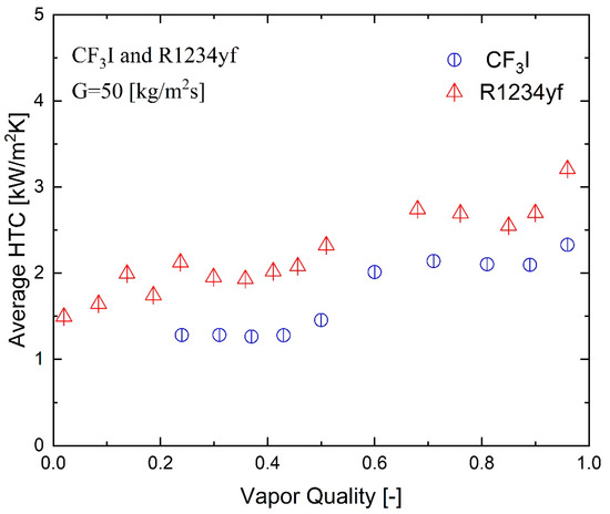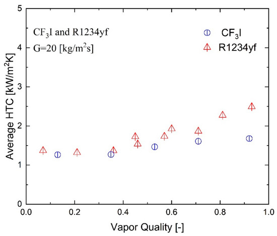 x > 0.50). For instance, in the plate heat exchanger, the heat transfer coefficient for R1234yf was almost 1.5 times higher than that for CF