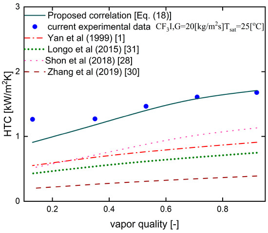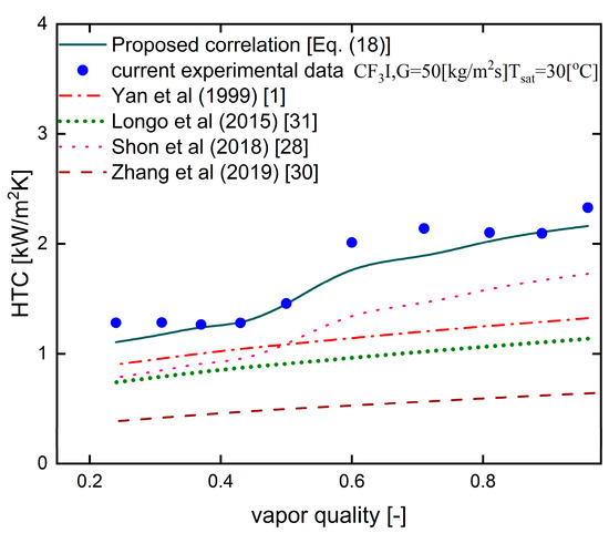 2s. It is observed that all the correlations underestimate the experimental heat transfer coefficient data for CF