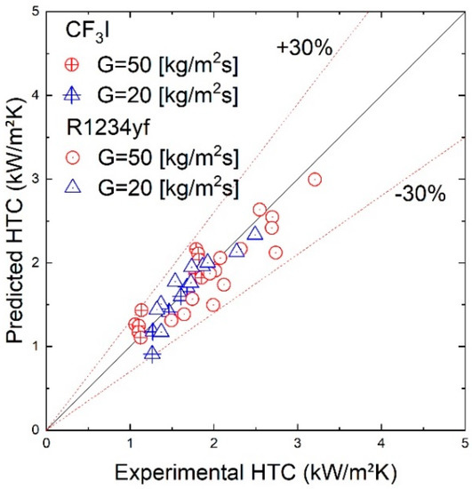 Figure 15 shows the comparison of experimentally measured heat transfer coefficients for R1234yf and CF